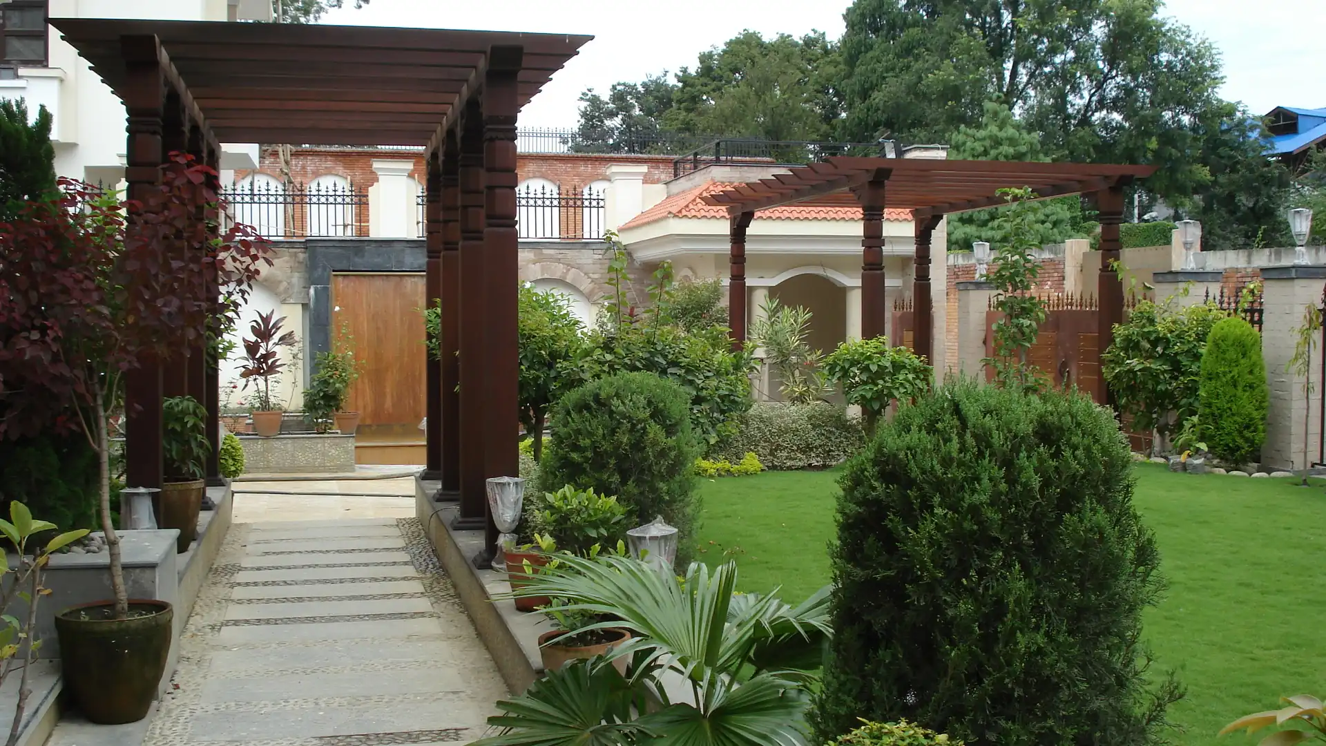 This beautifully executed project showcases the craftsmanship and precision of traditional wood carving, seamlessly blended with modern landscaping and architectural design. The intricate wooden pergolas seen in the image were entirely hand-carved by the company’s skilled artisans, using time-honored techniques passed down through generations. Each column features detailed work that highlights the depth of Nepali heritage craftsmanship, requiring not only artistic vision but also deep knowledge of wood behavior, durability, and weather resistance.